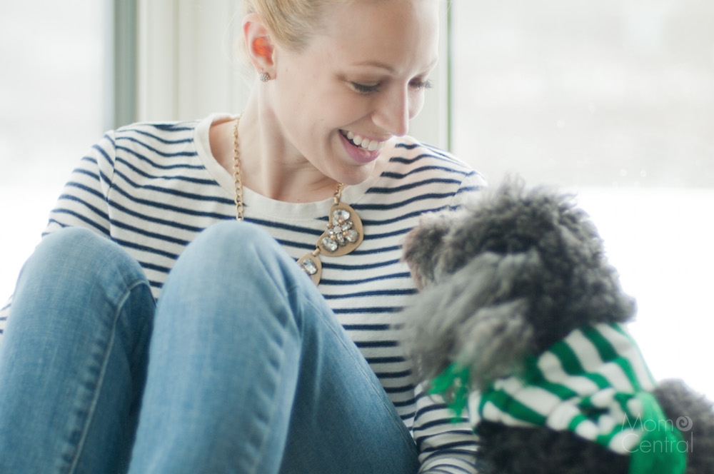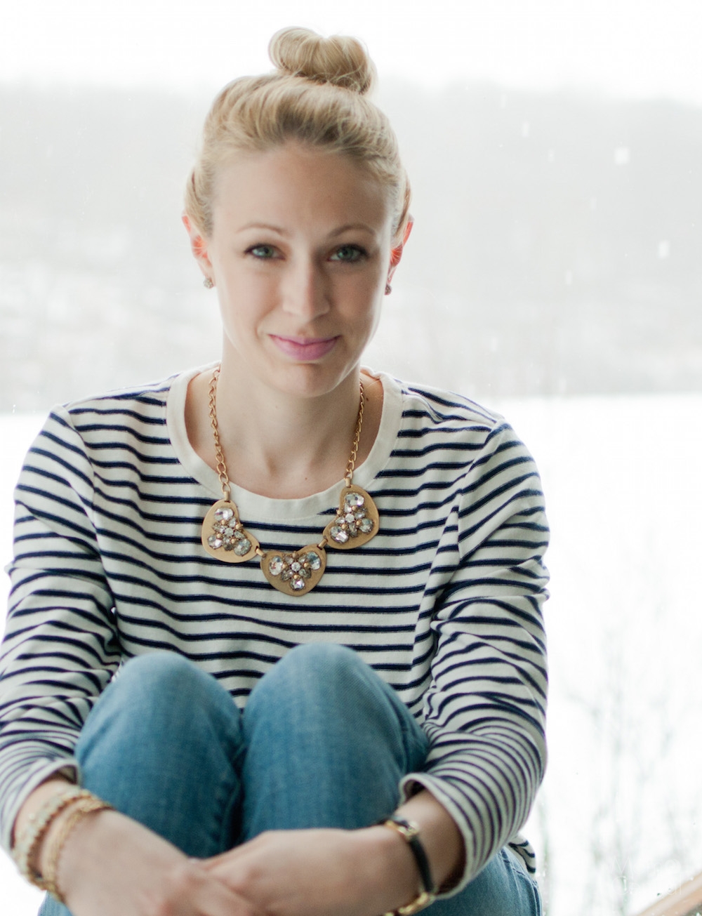 This outfit is very typical of what I like to wear, the nautical stripes are an easy go-to for me, and I like to accessorize with some simple jewelry and a fun shoe, leopard print flats in this instance. I’ve also been in a very long gold “phase” and tend to wear gold jewelry like my necklace and bracelet featured in these photos. A few daily staples are my Marc Jacobs watch and gold stud earrings I got at a church rummage sale – great place for spotting unique finds.